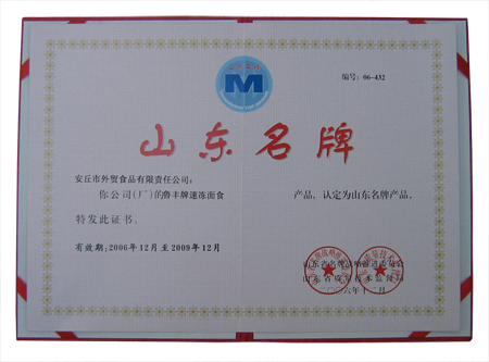 公司生产的"鲁丰"牌速冻面食产品荣获"山东名牌产品"称号!