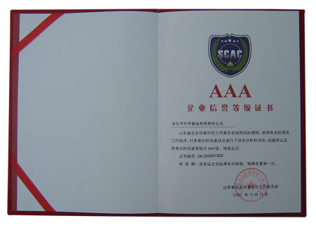 公司被山东省企业信誉评价工作委员会评为山东省AAA级信誉企业